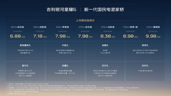 作为吉利银河旗下全新主流电混家轿,星耀6以最省购车成本、最省用车成本、最省养车成本,“三大最省成本”让用户省到极致,以B级空间、20万级安全、旗舰级智能、“开不坏”的品质“四大越级满配”实现全维大满足,重新定义“国民家轿”价值标杆。