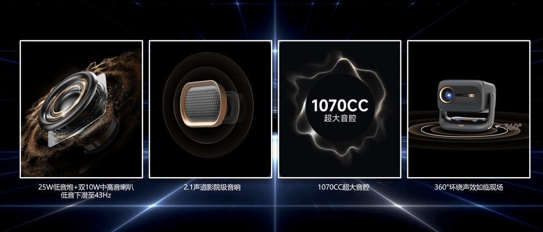 音质层面,R3 Ultra 同样做到了同级甚至越级无对手。团队巧妙利用一体化云台的底部空间,打造出1070CC超大音腔,内置25W独立低音炮与双10W中高音单元,低音下潜直达43Hz。当机器接入深度定制的网易云音乐,冰晶蓝低音氛围灯缓缓亮起,墙面歌词墙氛围感拉满,它便不再是一台单纯的观影设备,更是一台能融入家居的高质感氛围音响。
