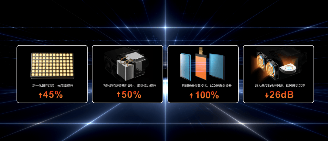这份突破是全链路技术重构的结果:屏幕升级至5吋,显示面积较4.45吋提升26%;新一代超亮灯芯加持,光效直接提升45%;再搭配首创屏偏分离技术与超大悬浮轴承三风扇,散热能力同步跃升50%。环环相扣,才撑起了这份越级的亮度表现。
