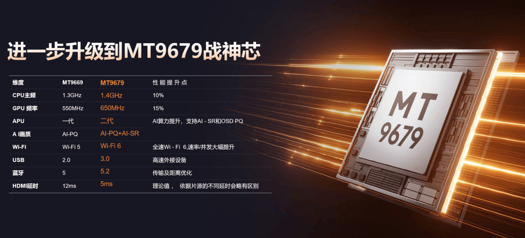 核心配置同样拉满规格,MT9679 顶尖芯片加持,带来5ms超低延迟,追剧游戏全程丝滑;通过赛西低疲劳+ SGS低蓝光双护眼认证,在追求极致画质的同时守护视觉健康,全家观影更安心。外观设计上也下足功夫,高级灰色机身搭配香槟金电镀细节,科技质感与家居美学兼顾得恰到好处。