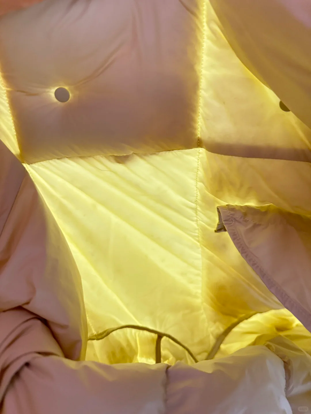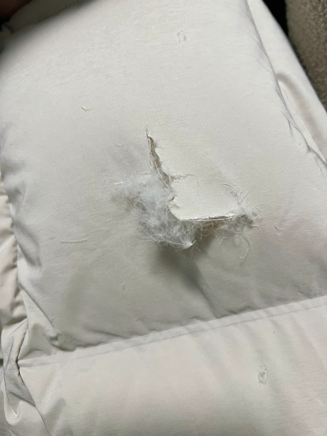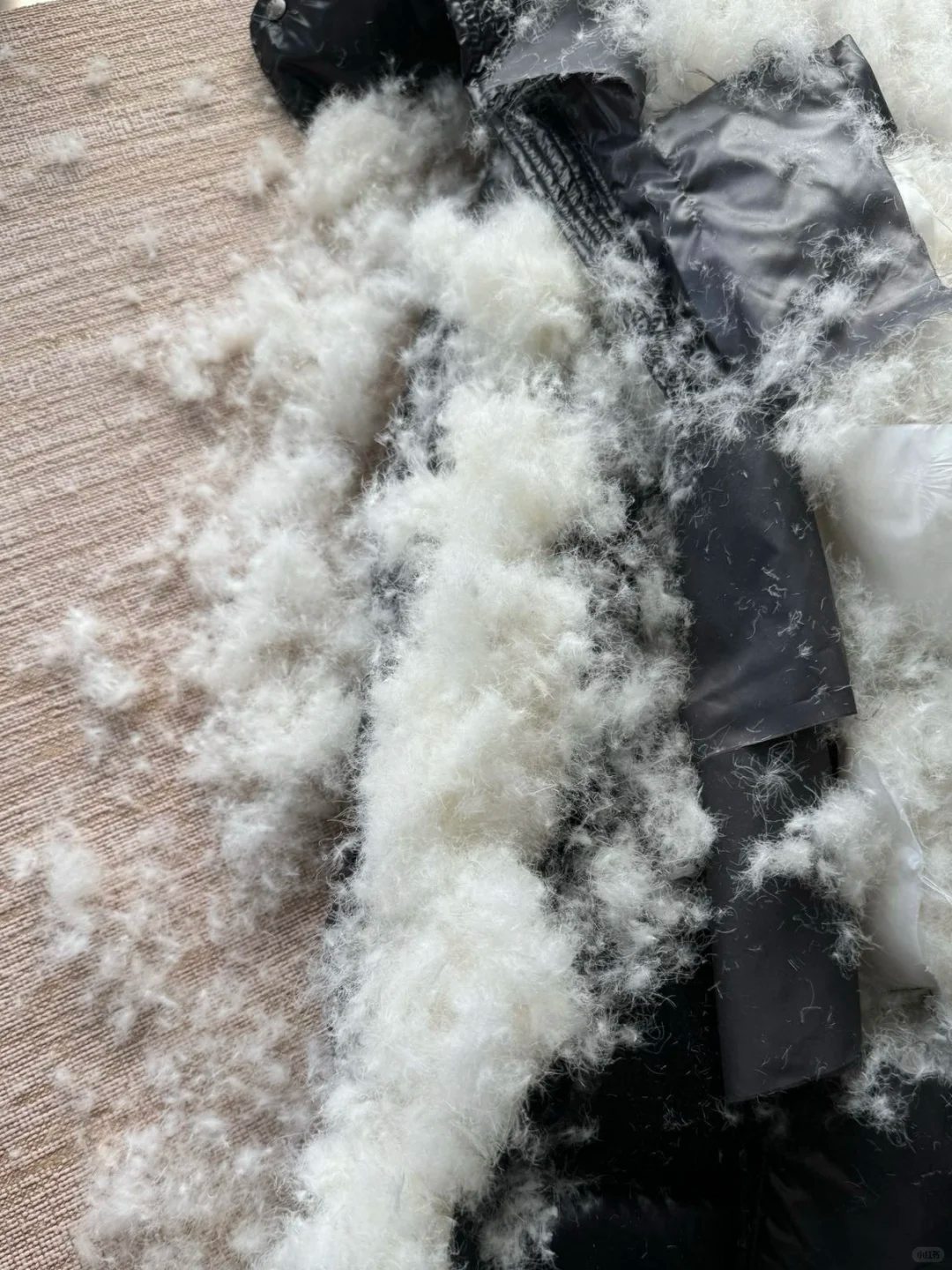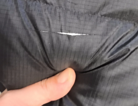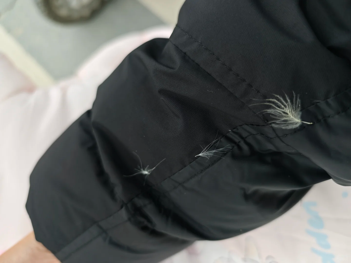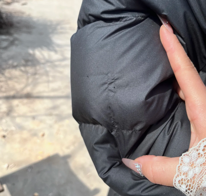 比如面料比较薄,特别薄的面料,就有可能在穿着的时候不小心刮坏,因为它的耐磨程度没有那么高,刮坏了之后就会导致里面的羽绒漏出来,后期还要修补。