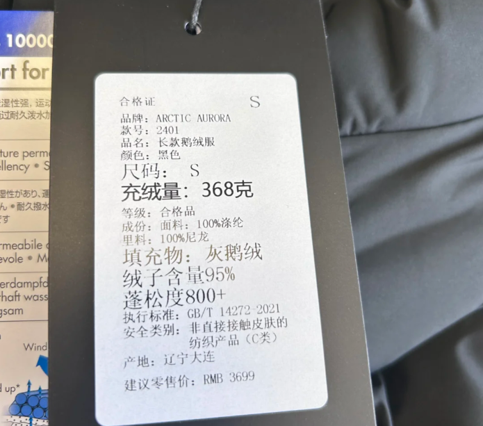 所以买羽绒服,首先看标签上面的这4个字,就是绒子含量。如果没有绒子含量,上面只标注含绒量,这种羽绒服都是以前生产的旧国标羽绒服,