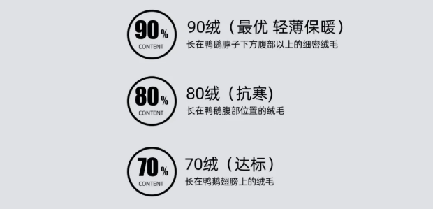 一般来说超过90%的绒子含量,就算是比较优良的羽绒服,95%能够达到最佳,如果低于50%这样的羽绒服是不达标的,