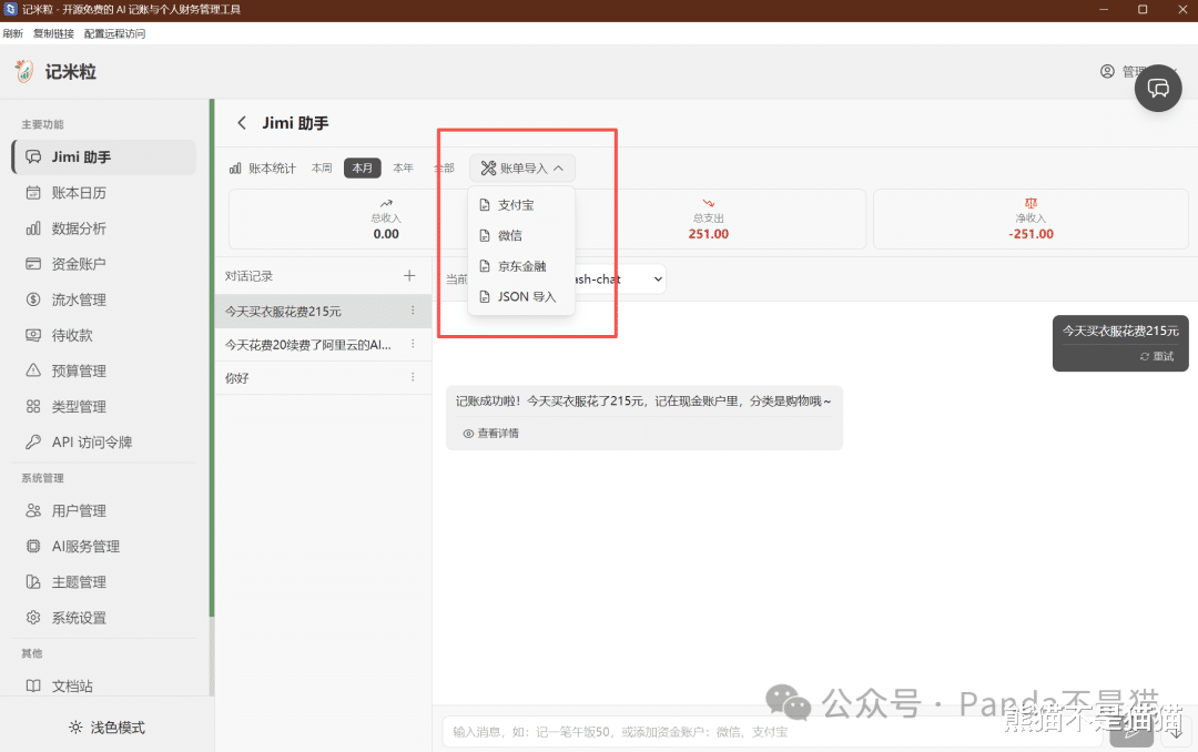 核心功能详解Jimi助手算是这个项目的亮点功能。在配置好AI之后,就能通过对话框直接用自然语言进行记账。比如说"今天午餐花了35块",Jimi会自动识别并记录。同时这里也支持导入支付宝、微信以及京东的账单,不过需要自行去对应的APP中导出CSV文件。