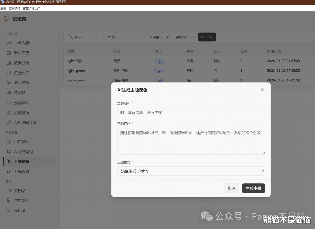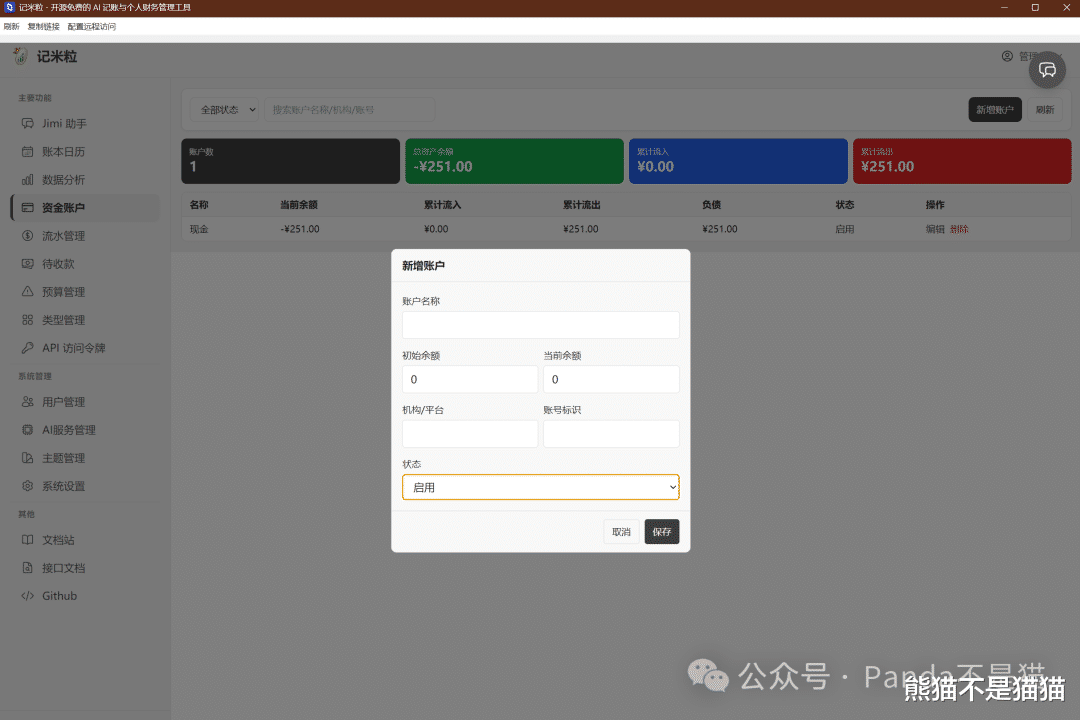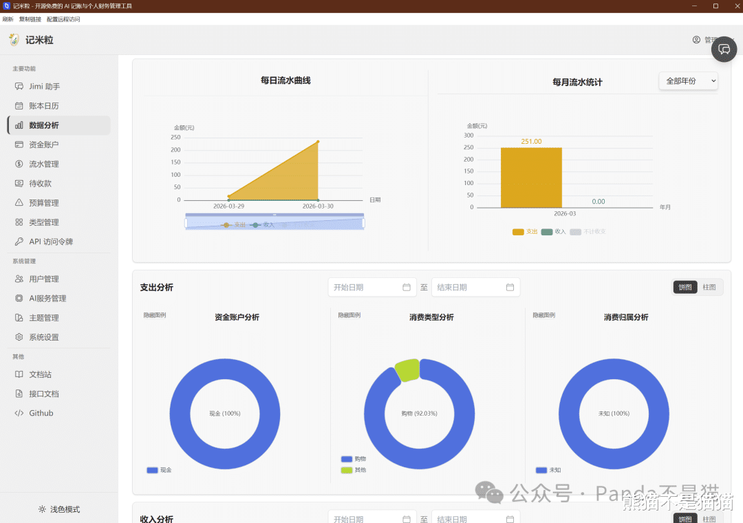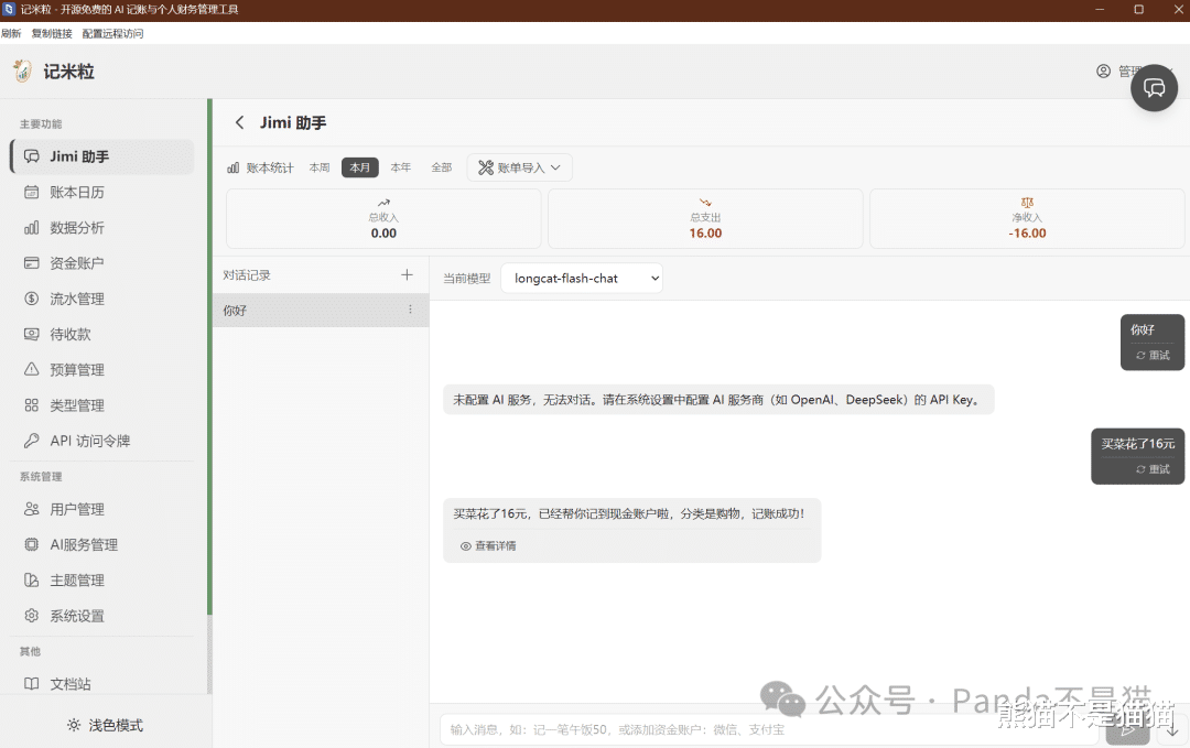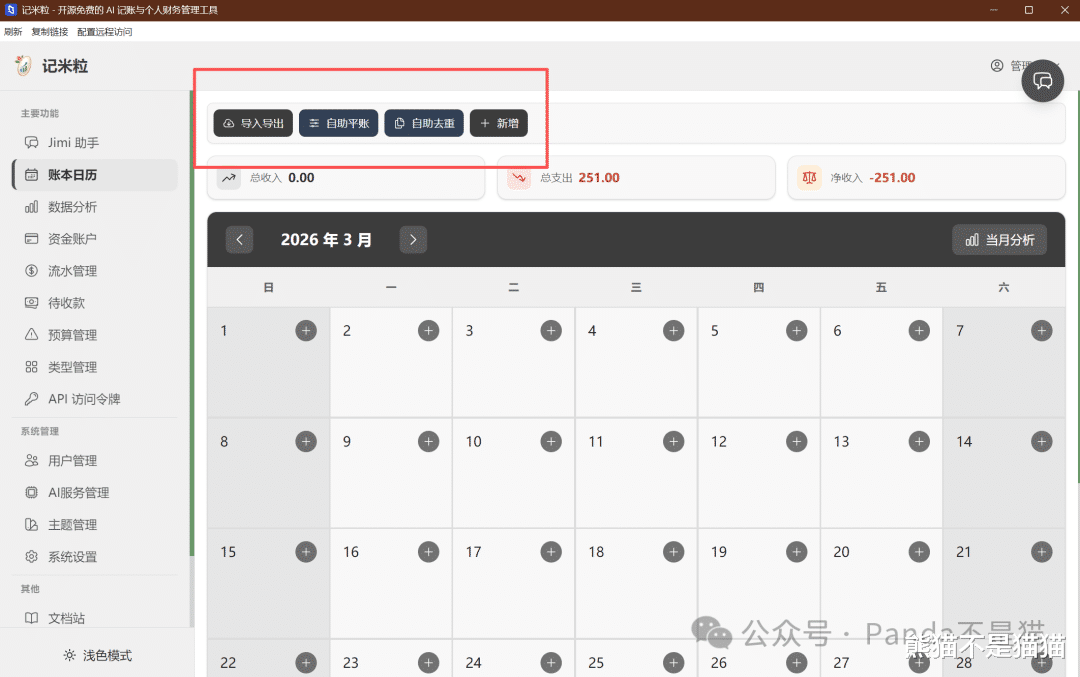 左侧侧边栏分为了Jimi助手、账本日历、数据分析、资金账户等几个板块。熊猫登录的是管理员账户,所以下方还有系统管理设置,可以管理用户、AI服务以及系统设置。普通用户登录就看不到这些,权限管理做得还是挺清晰的。