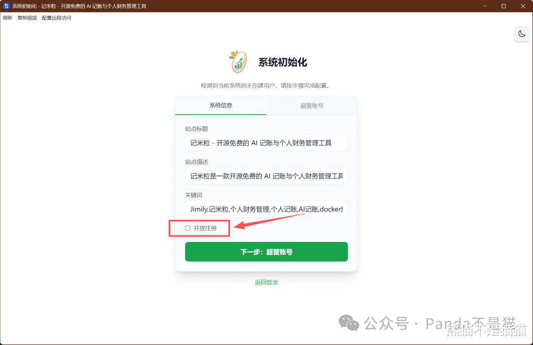 最后确定无误启动项目就行了,启动之后通过极空间的远程访问功能就可以访问初始化界面了。这里可以勾选是否开放注册,当然后续在系统设置中也可以调整。