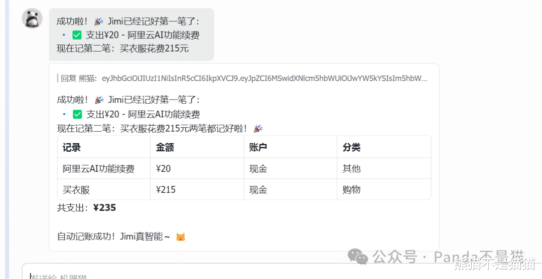 随后将生成的Token也发给龙虾,这时候就能通过飞书、微信等对接龙虾的渠道直接生成账单。比如说在微信里给龙虾发"今天买咖啡花了28元",它就会自动调用记米粒的API完成记账。比起打开web或APP手动输入,这种自然语言直接记录的方式确实更为方便。