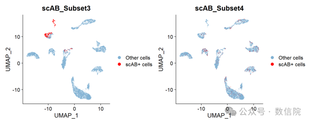 可视化单细胞的不同模块UMAP_subset3 <- DimPlot(sc_dataset,group.by="scAB_Subset3",cols=c("#80b1d3","red"),pt.size=0.001,order=c("scAB+ cells","Other cells"))UMAP_subset5 <- DimPlot(sc_dataset,group.by="scAB_Subset4",cols=c("#80b1d3","red"),pt.size=0.001,order=c("scAB+ cells","Other cells"))UMAP_subset <- patchwork::wrap_plots(plots = list(UMAP_subset3,UMAP_subset5), ncol = 2)UMAP_subset