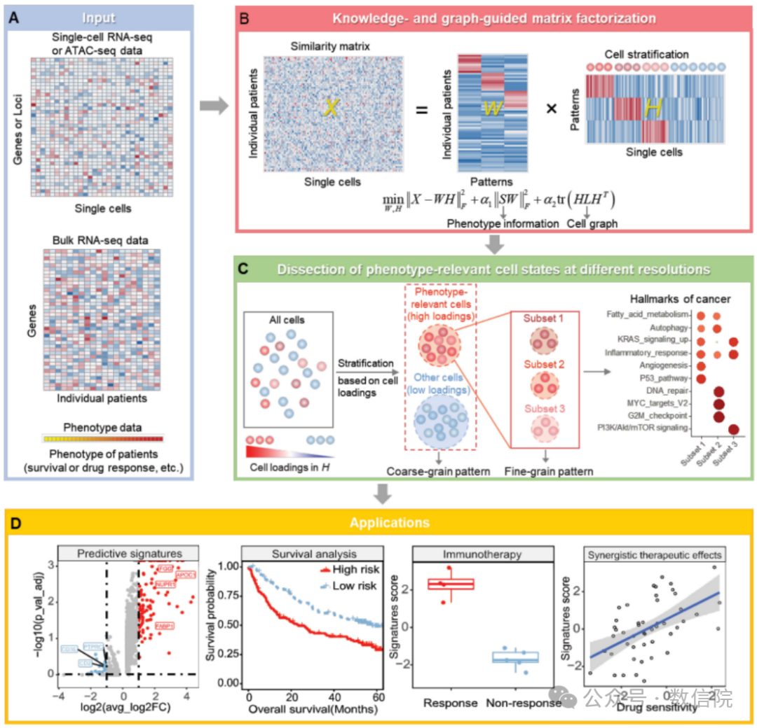 发表于NAR[scAB detects multiresolution cell states with clinical significance by integrating single-cell genomics and bulk sequencing data],文章Fig1其实清晰展示了算法的核心思想,输入为scRNA或scATAC数据和bulkRNA数据,然后进行类似[矩阵分解]的操作,输出为W矩阵[行为bulk样本,列为模块]和H矩阵[行为模块,列为单细胞],最后就可以基于H矩阵进行下游推断任务——分群/通路富集/生存分析等。