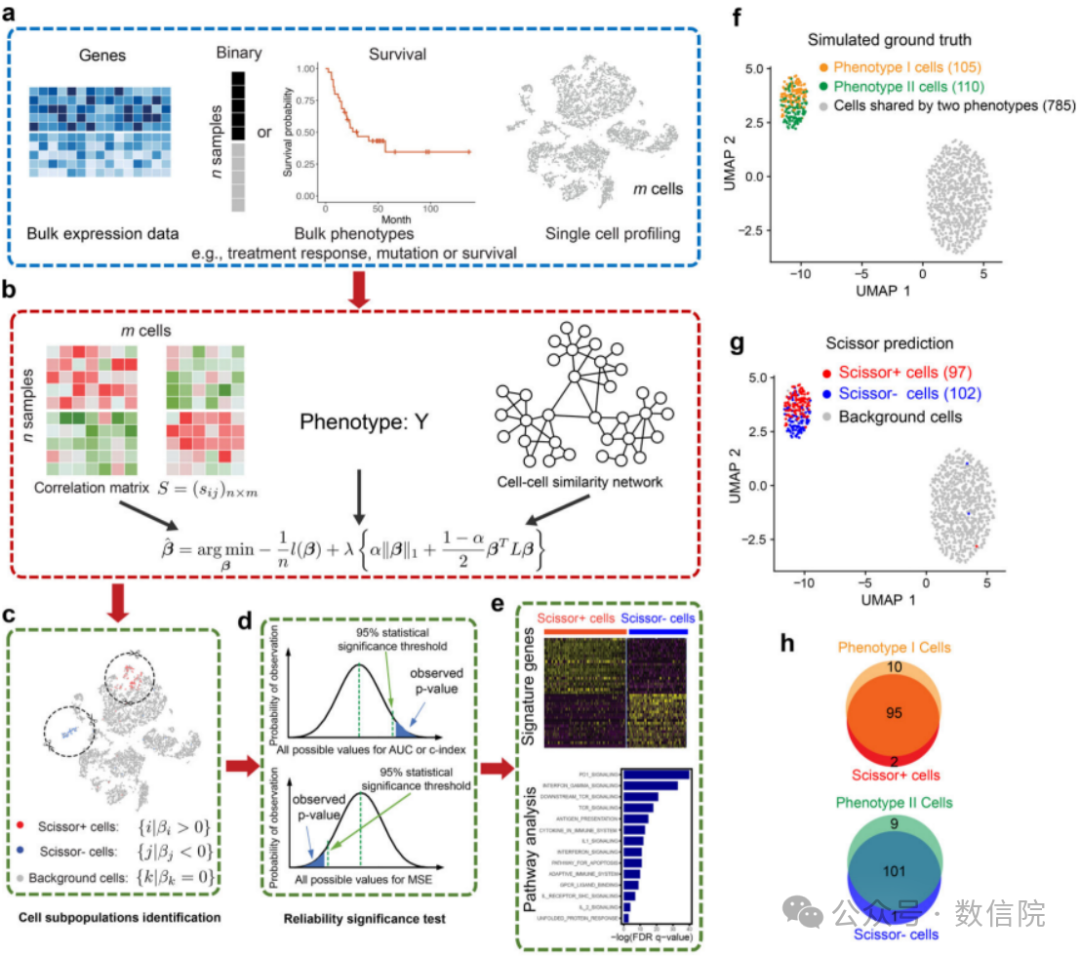 发表于生信顶刊NBT[Identifying phenotype-associated subpopulations by integrating bulk and single-cell sequencing data],文章Fig1也清晰展示了算法的核心思想,输入为scRNA数据和bulkRNA数据,然后通过构建[细胞相似性网络]的操作,输出为每个单细胞和bulk表型相关的标签,最后就可以基于表型标签进行下游分析——分群/通路富集/生存分析等。