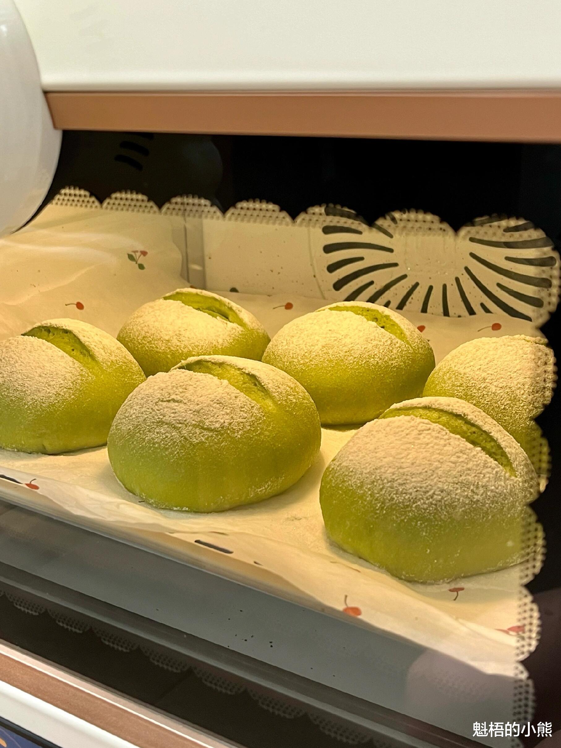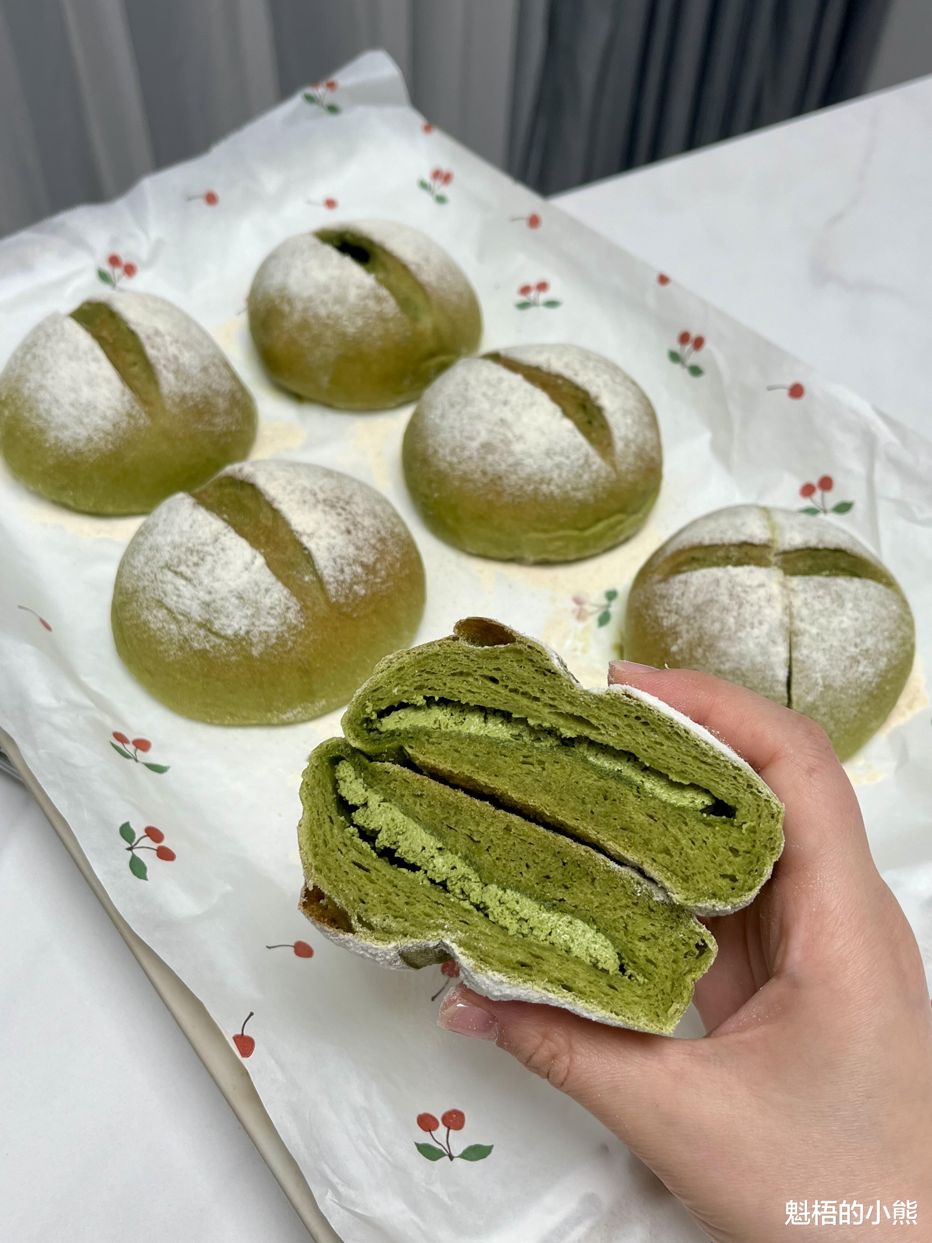 烤好的抹茶米面包,外皮微微焦黄,割口裂开,露出翠绿的抹茶乳酪。掰开一个,面包体软糯Q弹,压下去能回弹,里面的抹茶乳酪馅顺滑细腻。咬一口,面包软糯有嚼劲,像在吃麻薯,抹茶的清香在嘴里散开,乳酪馅奶香浓郁,甜而不腻。双重抹茶的味道层层叠加,真的让人一口接一口停不下来。