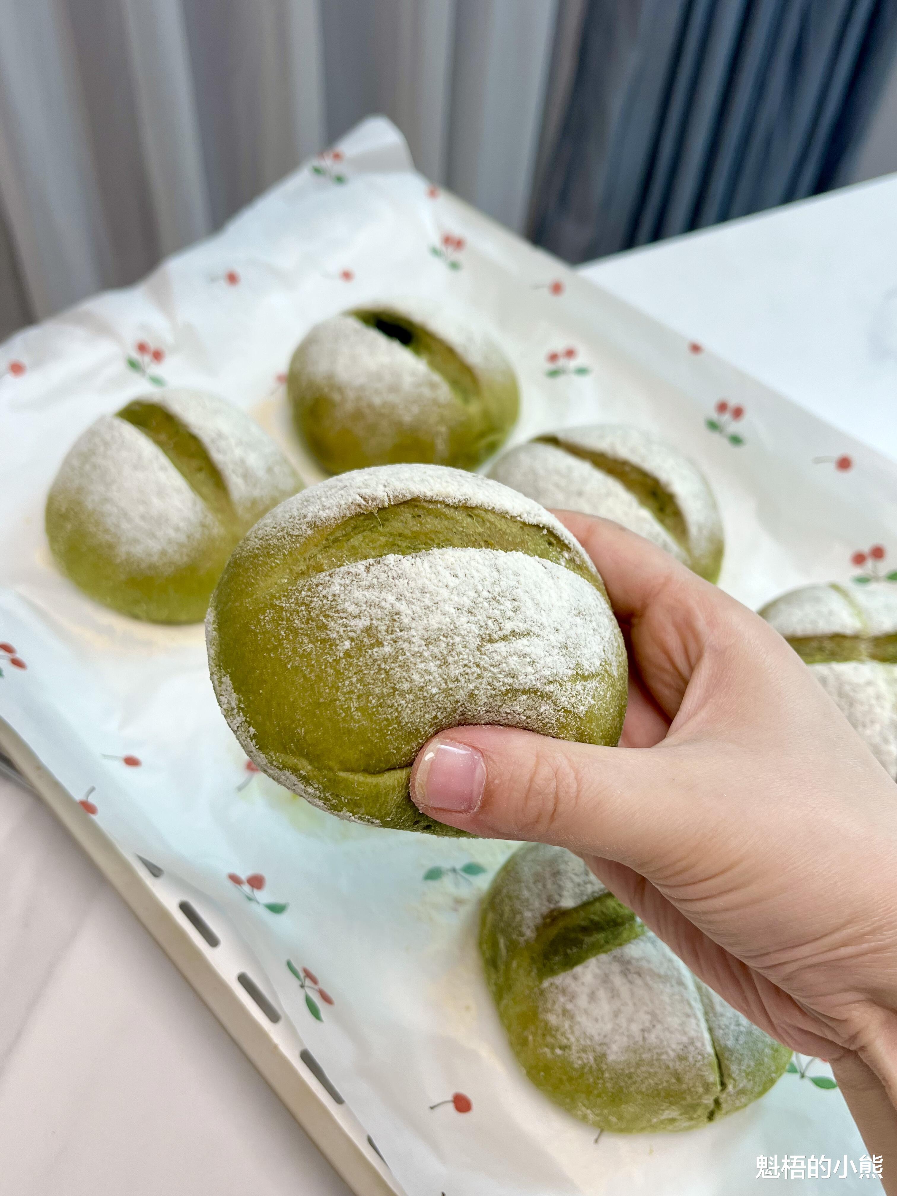 刷手机的时候,看到手作店的抹茶米面包,一个就要30多块,评论区还天天抢不到。我盯着屏幕看了半天,心想:米面包到底能有多好吃?直到我自己试了一次,出炉的那一刻,整个人都愣住了——面包软糯Q弹,切开是翠绿的抹茶乳酪馅,双重抹茶的香气在嘴里化开,比外面卖的还好吃。孩子放学回来,一口气吃了2个,边吃边说:“妈妈,这个面包好软,糯糯的,里面还有抹茶馅!”从那以后,这款抹茶米面包就成了我家烘焙的保留节目。最让我得意的是,手揉就能成功,只需要一次发酵,省时省力,抹茶脑袋一定要试试。
