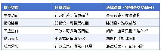 附加疑问句的语法结构天然地倾向于“是/否”回答。在法庭这一高度形式化的语境中,偏离这一结构的回答(如解释、修正、质疑前提)往往会被法官或对方律师制止或打断。这种语法约束在实践中转化为对当事人回应空间的制度性限制。