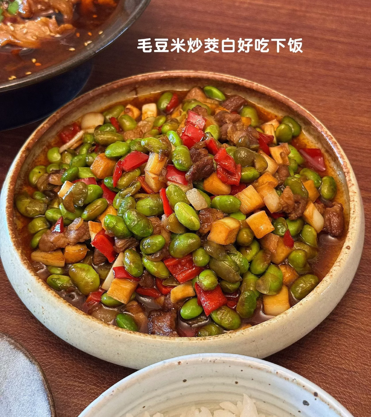 装盘的时候,毛豆的碧绿、茭白的嫩白、红椒的鲜红、肉丁的酱色,四色交织,看着就让人胃口大开。夹一筷子送进嘴里,毛豆软糯中带着韧劲,茭白脆嫩爽口,肉丁的油脂香和姜蒜的辛香融在一起,清淡却不寡淡,鲜香而不油腻。那种感觉,就像春天午后的一阵微风,舒服、妥帖。