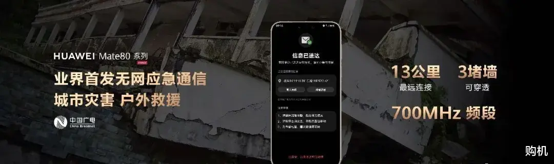华为Mate80系列首发700M无网应急通信,在地震、洪水或是野外失联等断网险情下搭建生命通道,打通用户与救援队最后一公里的沟通链路。700MHz应急频段救援信号,可以穿透3层楼的深度,覆盖超过13公里的通信距离。