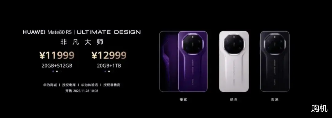 在售价方面,华为Mate 80系列具体如下:【华为Mate 80】12+256GB版4699元,12+512GB版5199元,16+512GB版5499元;【华为Mate 80 Pro】12+256GB版5999元,12+512GB版6499元,16+512GB版6999元,16GB+1TB版7999元;【华为Mate 80 Pro Max】16+512GB版7999元,16GB+1TB版8999元;【华为Mate 80 RS非凡大师】20GB+512GB版11999元,20GB+1TB版12999元。