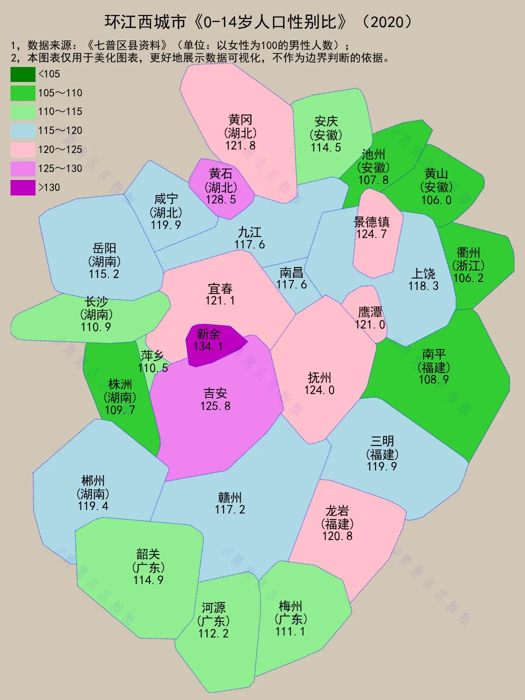 为了观察新余周边城市是否也有类似的情况,我们将标准行政区划地图转化为凸包算法图(仅用于展示数据,不作为判断边界的依据),用来观察江西及环江西地级行政区的0至14岁人口性别比分布情况。