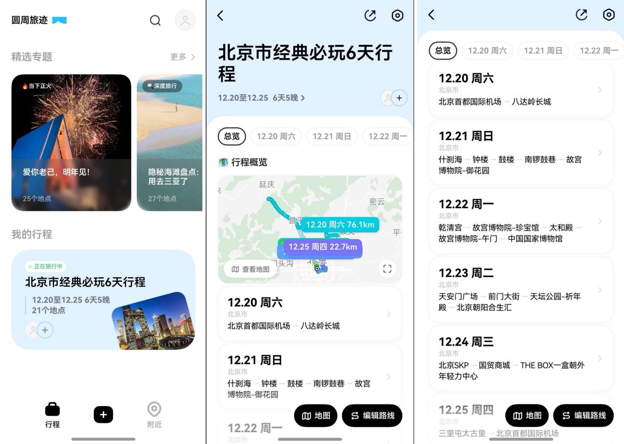 爱旅行的我现在也是【圆周旅迹】的重度用户,只需在圆周旅迹上输入去哪座城市、去多久,它就可以智能规划出经典必玩路线。让旅行变得异常轻松。