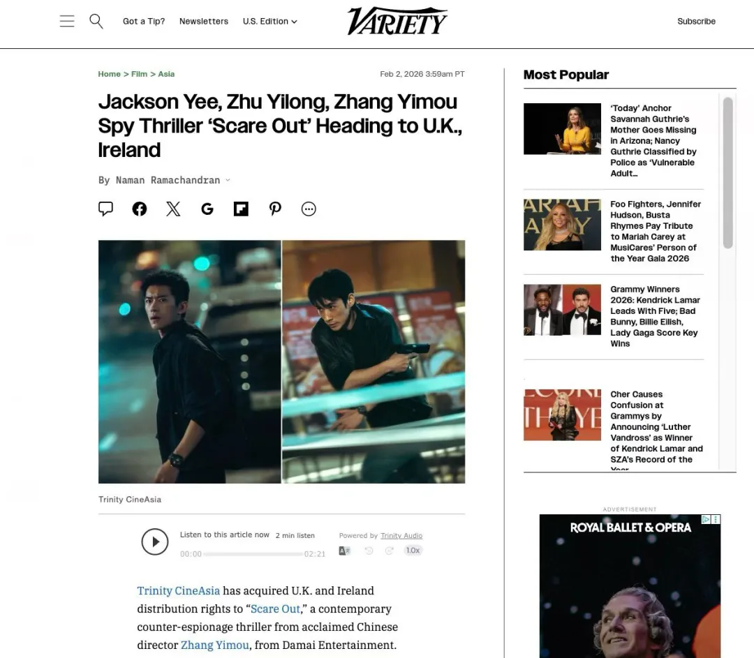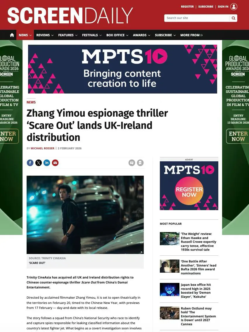 英国、爱尔兰地区《惊蛰无声》定档2月20日,大年初一2月17日与国内同步开启限定点映。海外多家主流媒体也对影片即将在英国、爱尔兰上映的信息进行了报道。