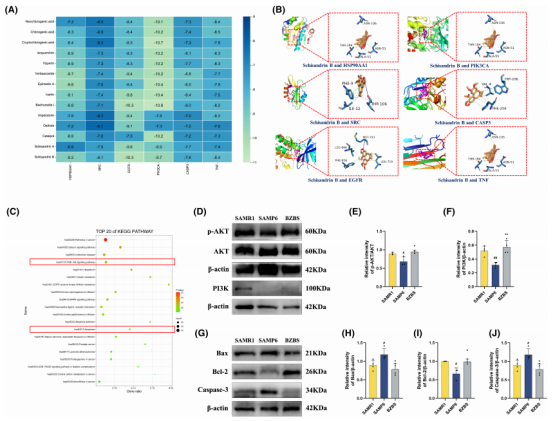 通过整合超高效液相色谱(UPLC)与网络药理学分析,研究筛选出八子补肾的14种活性成分(如五味子乙素、淫羊藿苷等)及其作用的181个关键靶点。KEGG通路富集显示,PI3K-AKT信号通路与凋亡通路是八子补肾抗骨质疏松的核心机制。分子对接验证表明,活性成分与HSP90AA1、CASP3等靶点结合稳定,其中五味子乙素(Schisandrin B)表现出最强亲和力。Western blot实验进一步证实,八子补肾激活PI3K-AKT通路(上调p-AKT、PI3K),同时抑制促凋亡蛋白Bax和Caspase-3表达,促进抗凋亡蛋白Bcl-2生成,从而协同调控骨形成与骨吸收平衡。