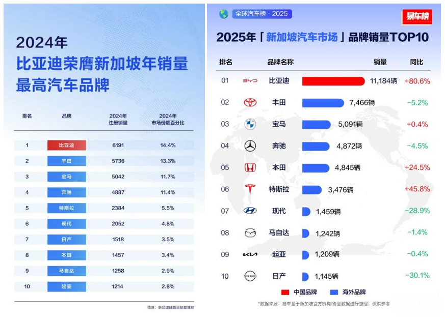 “车市小喇叭”获悉,比亚迪海外再度传来好消息!据新加坡陆路交通管理局近期的数据显示,2025年,比亚迪乘用车在新加坡销售11184辆,同比增长80.6%,蝉联年度全品牌销量冠军。自2022年,比亚迪正式进入新加坡乘用车市场,仅用两年时间成功登顶榜首,助力新加坡电动化转型。