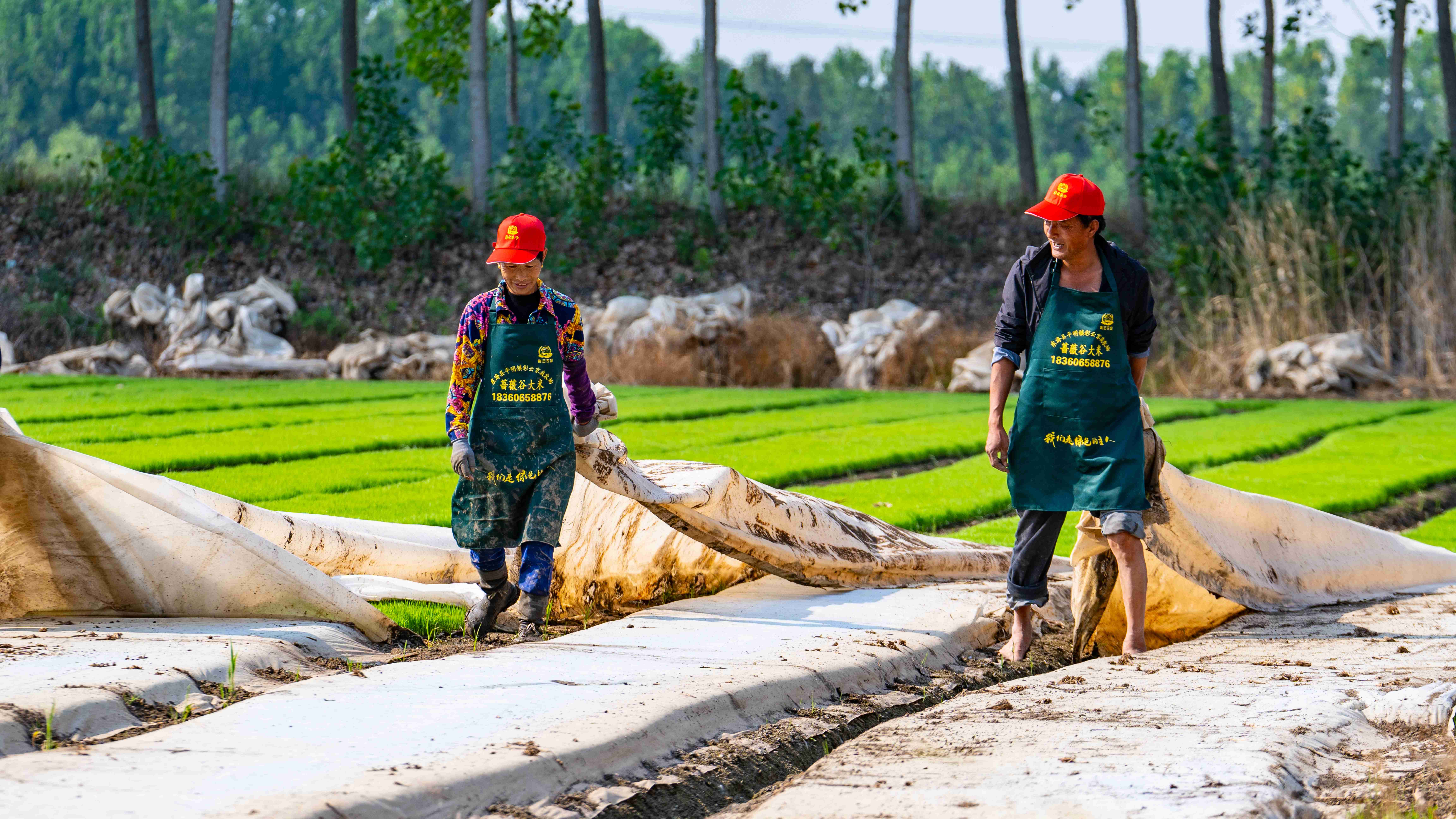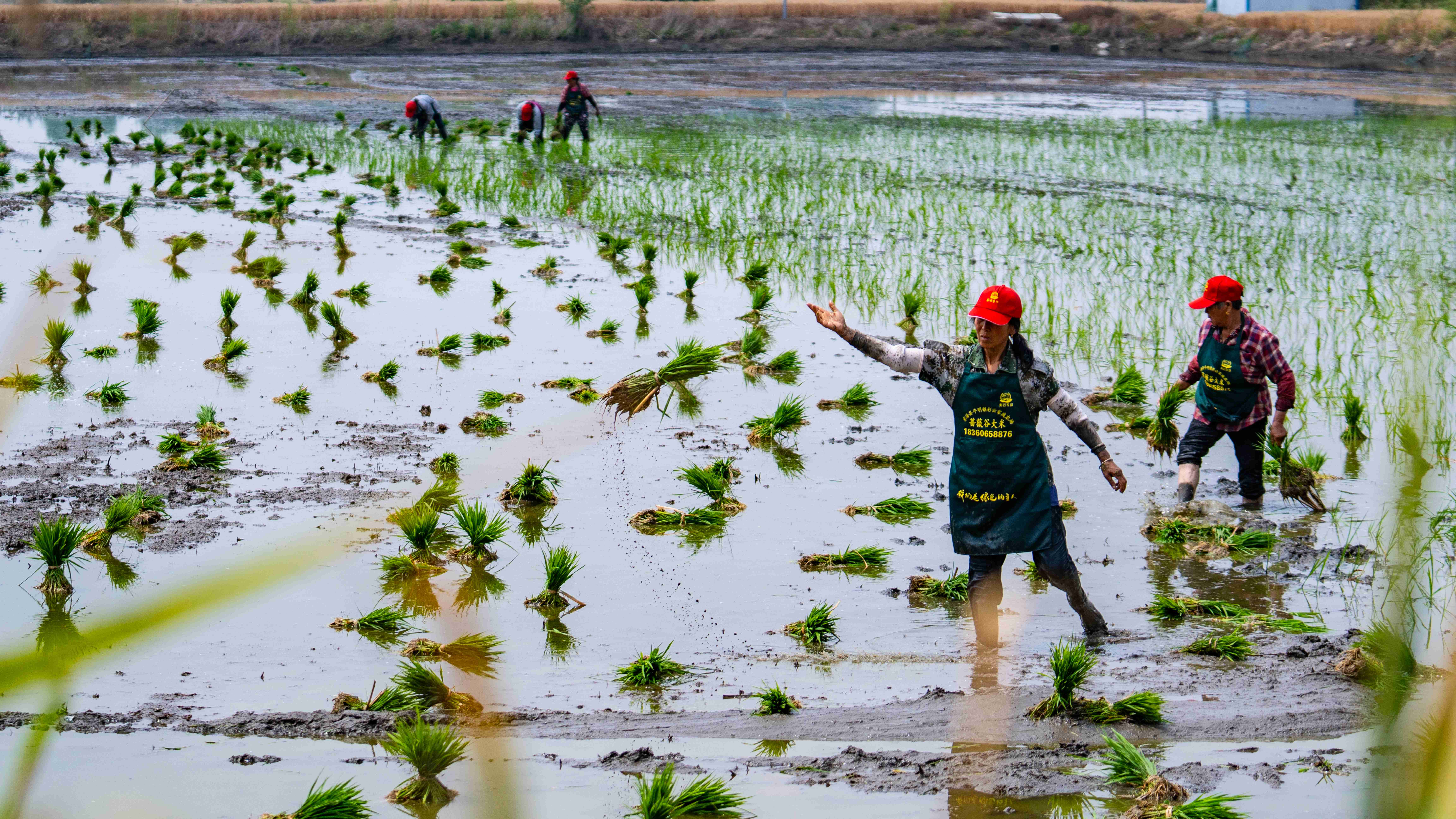 6月8日,在江苏省东海县平明镇彩云家庭种植农场里,高标准农田鳞次栉比,田间道路、硬化沟渠纵横交织,朱彩云带领村民们挽起袖子、卷起裤腿,有条不紊地对新出的水稻秧苗田进行无纺布撤除和水稻插秧工作。近年来,彩云农场不断探索“稻田综合种养”,大力推广“稻加鱼”、“稻加虾”等种养模式,科学利用土地空间、发展生态立体经济,推进农业现代化发展。