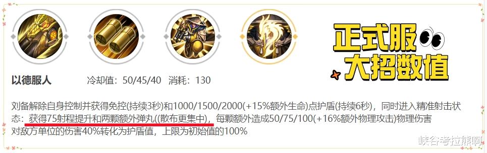 最后是三技能的调整:刘备解除自身控制并获得免控(持续3秒)和1000(+500/Lv)(+15%额外生命)护盾(持续6秒),同时进入精准射击状态:获得75射程提升,普攻可穿透,命中第一个目标后对身后目标造成50%伤害。对敌方单位的伤害40%转化为护盾值,上限为初始值的100%,冷却时间为50(-5/Lv)。