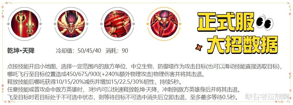 另外,官方在此基础上给哪吒新增了一个四技能,当他掷出乾坤圈,对所有敌方英雄施加炙炼火种并获得其视野,同时【乾坤·天降】施法距离拓展到全图(持续5秒)。