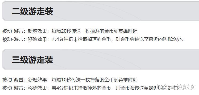 二三级游走装新增了每隔20/10秒传送一枚掉落的金币到英雄附近的效果,但代价是移除了4分钟时金币传送至最近防御塔的机制。