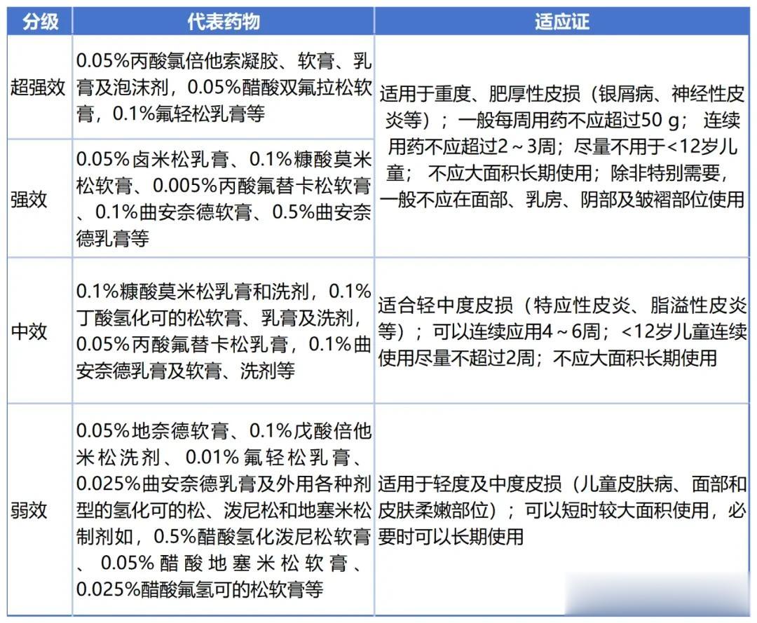 外用糖皮质激素是慢性湿疹抗炎止痒的一线药物,无需“谈激素色变”,规范使用安全性高。我国的糖皮质激素按作用强弱可以被分为4个等级,分别为:强效及超强效、中效、弱效。[2]其代表药物及适应证如下表所示: