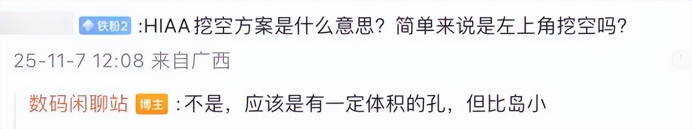 结合评论区的信息来看,HIAA挖孔方案“是有一定体积的孔,但比岛小”。