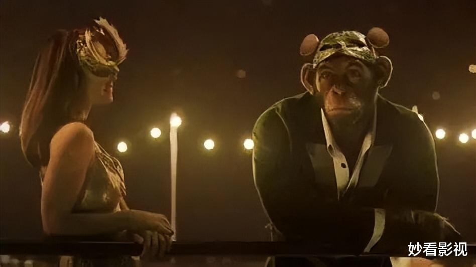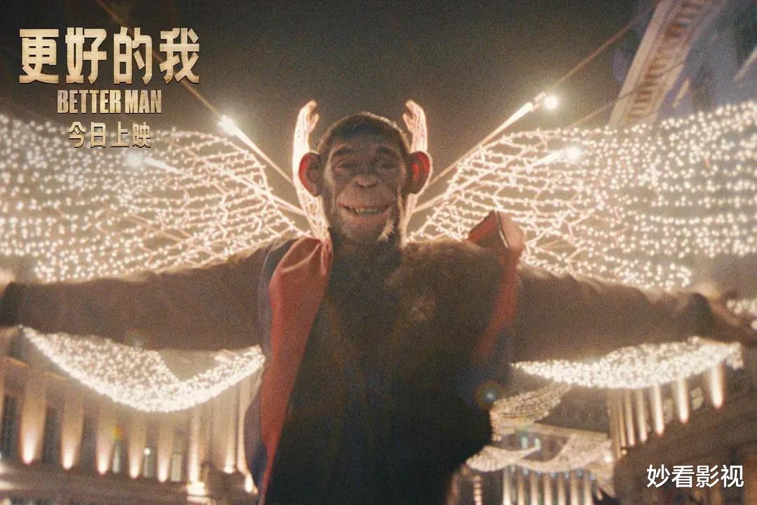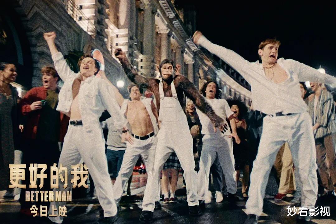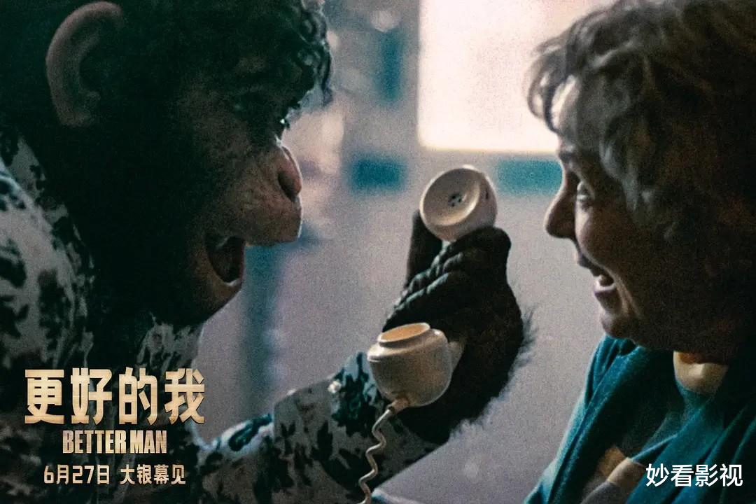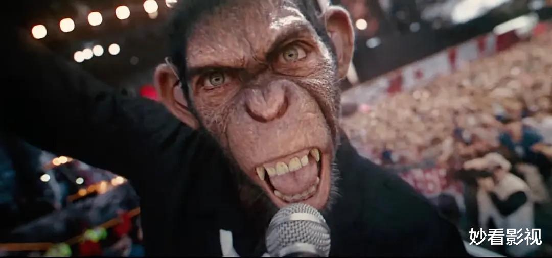 娴熟的CGI技术让猩猩完全拟人。当猩猩的眼眸中泛起泪光,当它在舞台上尽情狂欢又在独处时流露落寞,我们看到的早已不是一只动物,而是一个被异化、被自我束缚的普通人。舞台上的罗比是供人观赏的猩猩,台下的罗比只是一个渴望被爱、渴望认可的脆弱灵魂。