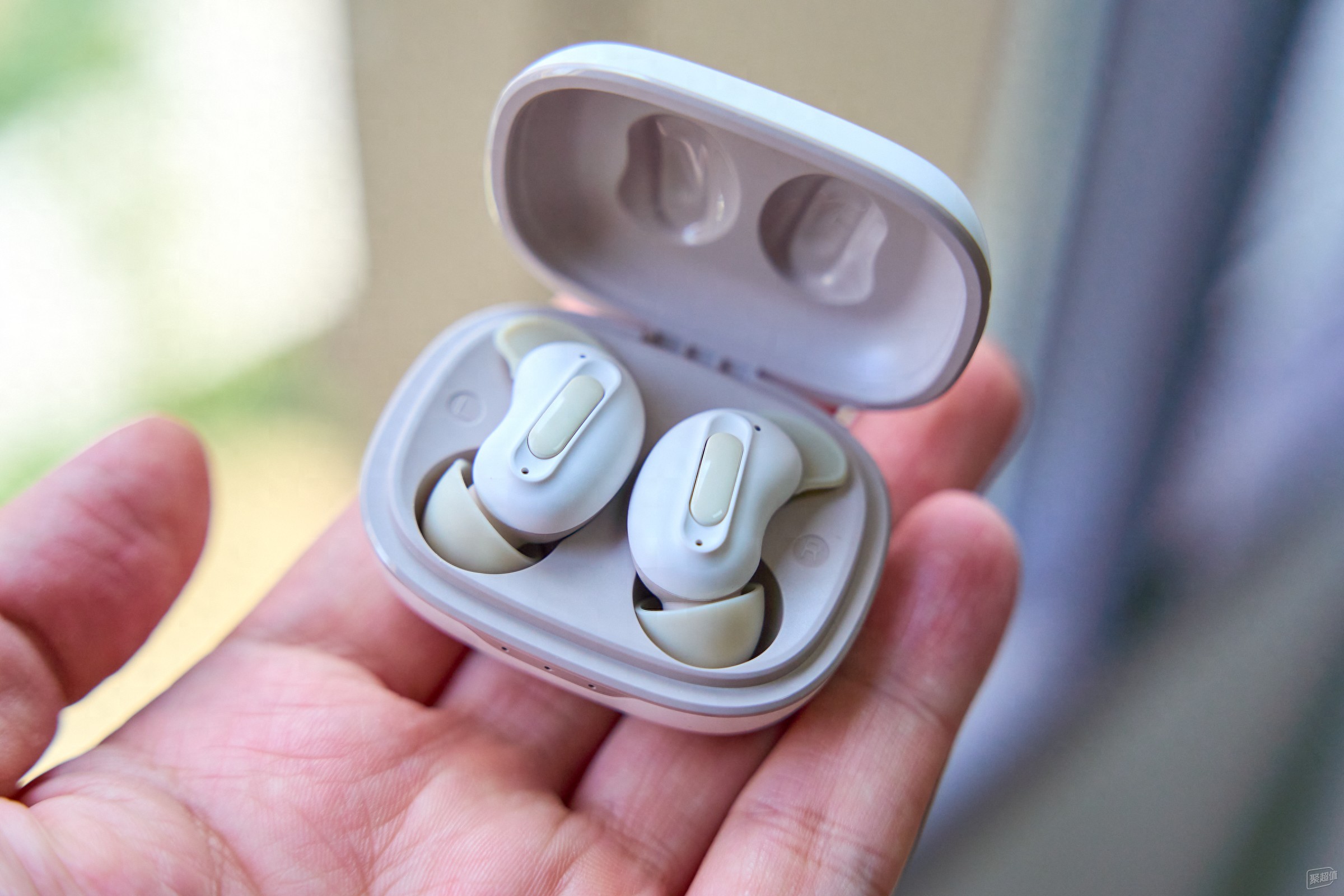 它的核心亮点就是小巧轻便,单只耳机仅重2克,外形小巧如莲子,采用奶嘴级液态硅胶材质,亲肤柔软,佩戴后几乎无异物感,侧睡时完全不压耳,翻身也不易脱落,敏感耳道可尝试。充电仓设计精致,采用磨砂质感,触感不错,体积小巧,便于携带,但材质偏薄,抗摔性一般,容易出现划痕和损坏,开合采用磁吸设计,阻尼感适中,取放耳机较为便捷。