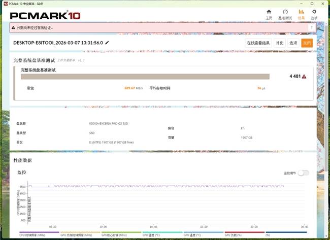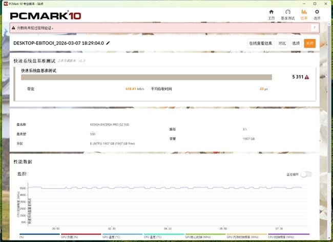 对于日常家用办公娱乐用户而言,PCMark10专业版的存储测试项目涵盖了真实办公、系统启动及各类应用加载,可以更精准地靠近他们的使用习惯。在完整系统盘基准测试中,铠侠VE10跑出了4481分,带宽达到689MB/s,平均访问延迟36μs;在完整系统盘基准测试中,铠侠VE10跑出了5311分,带宽达到618MB/s,平均访问延迟仅为23μs。
