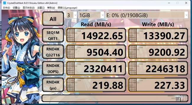 CrystalDickMark可以说是各大存储厂商的御用跑分软件了,因为它能很好地反映出一块硬盘的真实峰值性能。我手里这块铠侠VE10的测试结果为:顺序读写14,922/13,390 MB/s,随机读写2,320,411/2,236,318 IOPS。铠侠标参数一向比较老实的名声我是知道的,因此顺序读写和随机读取成绩我并不意外,而随机写入成绩能有这么高,倒是个意外之喜。