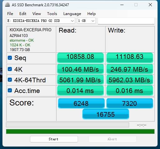 自SATA时代开始,AS SSD就是硬盘跑分测试的常客了,我也是看着我手里的硬盘从三百分到一千分,再到五千分、一万分逐步升级。但铠侠VE10这次跑了足足16755分,顺序读写全部破万,4K-64Thrd双双破5000MB/s,几乎是我上一块PCIe 4.0硬盘的三倍,性能是真的猛。