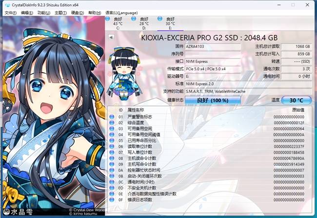 安装好铠侠VE10之后,开启CrystalDiskInfo看看参数,确认状态完全正常。