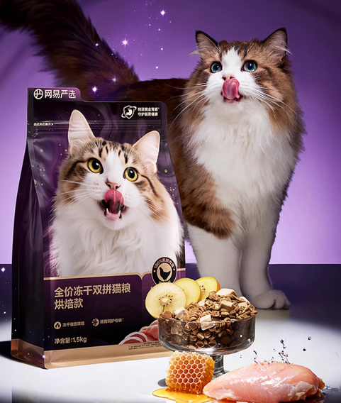 网易严选背靠大厂,有充足的受众,因此早期是凭借平价猫粮切入市场,主要走薄利多销的路线,产品也以满足猫咪基础营养为核心。这款猫粮则是主要面向中高端市场的冻干双拼烘焙猫粮,主打肠胃养护,将冻干直接镶嵌到猫粮颗粒中。另外,猫粮还添加了冻干鸡肉粒和冻干鸭肉粒成分,提高整体的适口性。猫粮的核心原料用的是鲜鸡肉、鲜鸭肉两种,动物性原料含量充足,因此整体的营养也相当不错,蛋白质42%,脂肪18%。