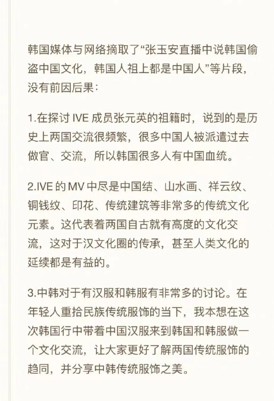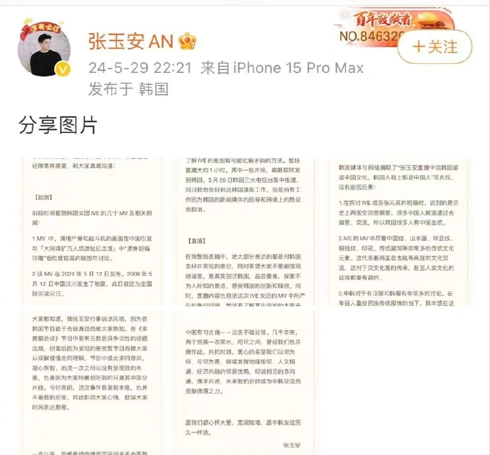 张玉安说ive女团抄袭中国传统文化,靠卖惨赚同情,韩国各大媒体报道此事,现在张玉安在韩国的工作机会全部被取消。