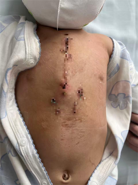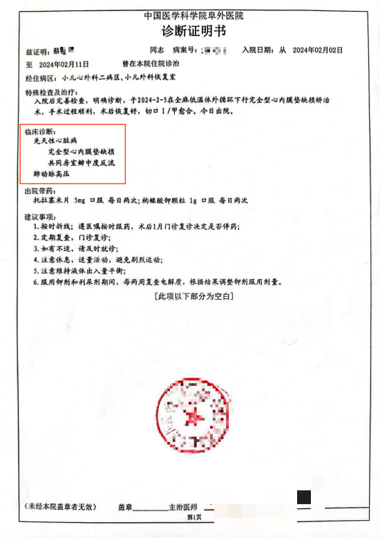 出于对三甲医院的信任,陈女士安心待产,2023年5月顺利产下宝宝。当时生产医院并未察觉宝宝有任何异常,直到出院回家后,她和家人慢慢观察,才发现孩子呼吸急促,宝宝出生17天带去检查,最终确诊先天性心脏病。经天津市儿童医院、北京阜外医院确诊,孩子患有完全性心内膜垫缺损,同时伴有重度肺动脉高压、二尖瓣反流等症状。2024年2月,孩子接受开胸手术,术后二尖瓣仍有裂隙,需每半年定期复查,是否需要二次手术尚未可知,孩子终身的健康风险,成为陈女士和家人心中难以释怀的痛。