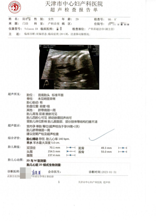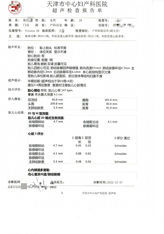 2022年12月27日,陈女士孕23+1周时,在天津市妇女儿童保健中心做四维超声提示胎儿肺动脉瓣狭窄,院方书面及口头均建议前往天津市中心妇产科医院做胎儿超声心动检查。她当日按医嘱检查,院方告知胎儿心脏结构无异常仅需复查;2023年1月31日复查,得到的依旧是心脏无异常的结论。