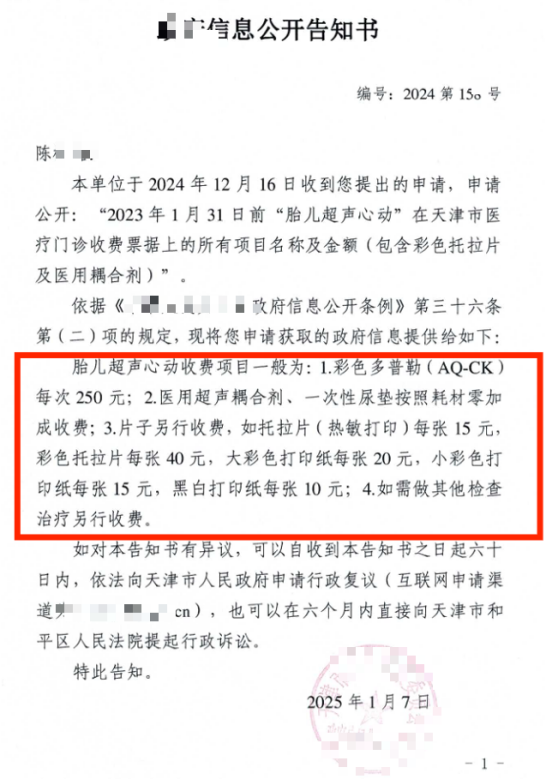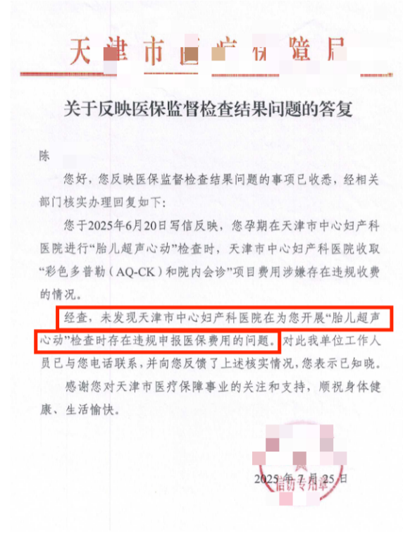 为核实真相,陈女士向天津市卫健单位申请信息公开,确认了胎儿超声心动的收费项目,而她的缴费票据显示,两次检查均足额缴纳了对应费用。随后她以医院收费与检查项目不符、涉嫌骗保为由举报,2025年7-8月,天津市医保单位两次出具红头文件,明确核查确认中妇医院为其开展的就是胎儿超声心动检查,无医保违规行为,医院医保部门也向监管人员确认了该事实。