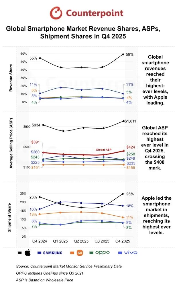 Counterpoint Research 资深分析师Shilpi Jain 指出,2025 年第四季智能手机市场同时受高端机型提前推出、部分地区价格调整,以及年终促销与分期、旧机换新方案影响,带动整体营收与平均售价成长。中端市场在促销活动与部分新兴市场购买力改善的支撑下,也对出货量成长有所贡献。