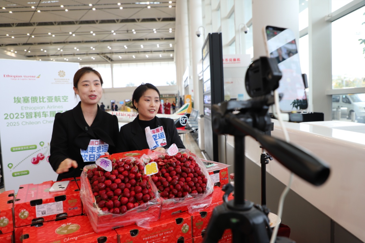 刚下飞机的车厘子就在花湖机场航站楼上了直播间。 通讯员王星予 摄