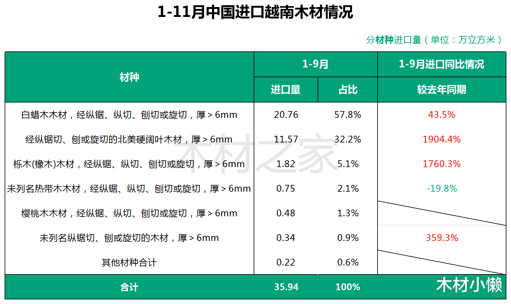 从全年进口情况分析,中越木材贸易呈现大幅增长态势,主要归因于白蜡以及北美硬阔叶锯材进口数量的增加。