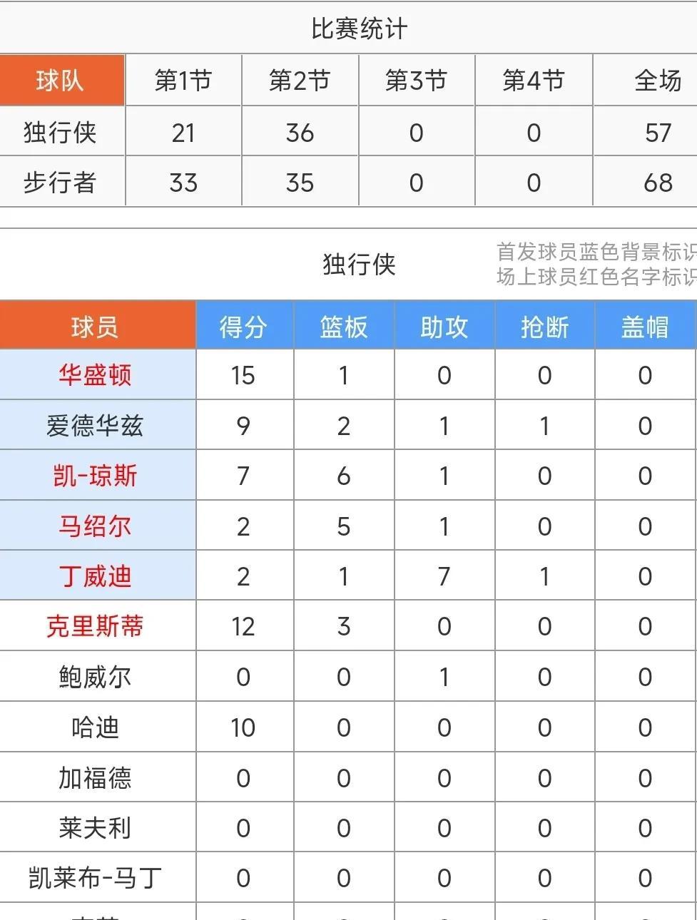 然而,时间对独行侠队来说是个大敌。尽管他们在最后时刻发起了猛烈的反扑,但还是无法完全抹平比分差距。随着上半场比赛结束的哨声响起,比分定格在57-68,步行者队依然保持着11分的领先优势。