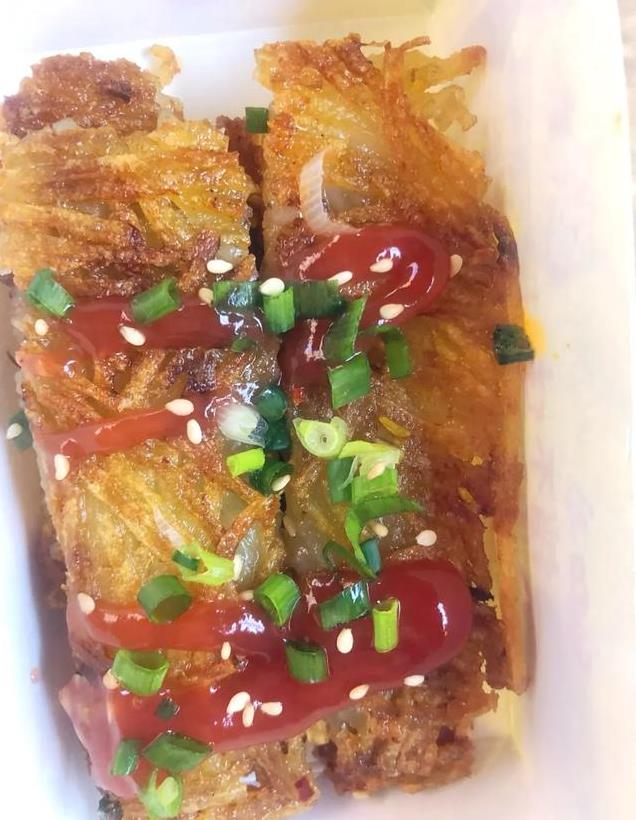 为了能吃到更多的美食,我们并没有点太多,吃完“古铺良食”以后,我们就来到了水亭门处,这里有不少小吃摊,土豆饼是我的心头好,一根根土豆丝被炸至金黄,再撒上葱花,滴上番茄酱,香脆酸甜,回味良久。