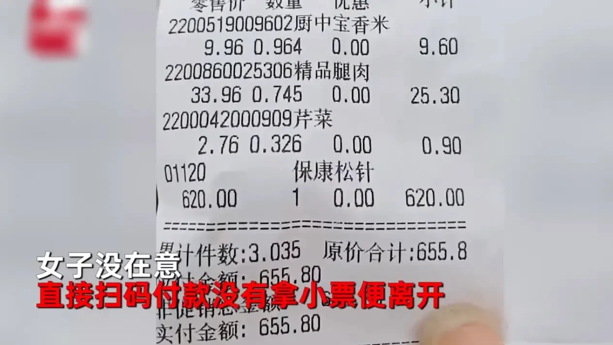 饭后,刘女士习惯性地翻看手机支付记录,却意外发现一笔655.8元的扣款,时间恰好与超市购物吻合。她顿时警觉起来,仔细翻找购物袋,找到了被随手塞进去的小票。小票显示,除了她购买的几样商品外,还多出了一项价值620元的茶叶。