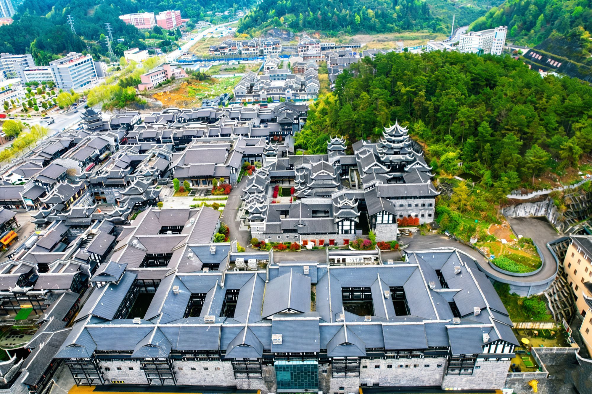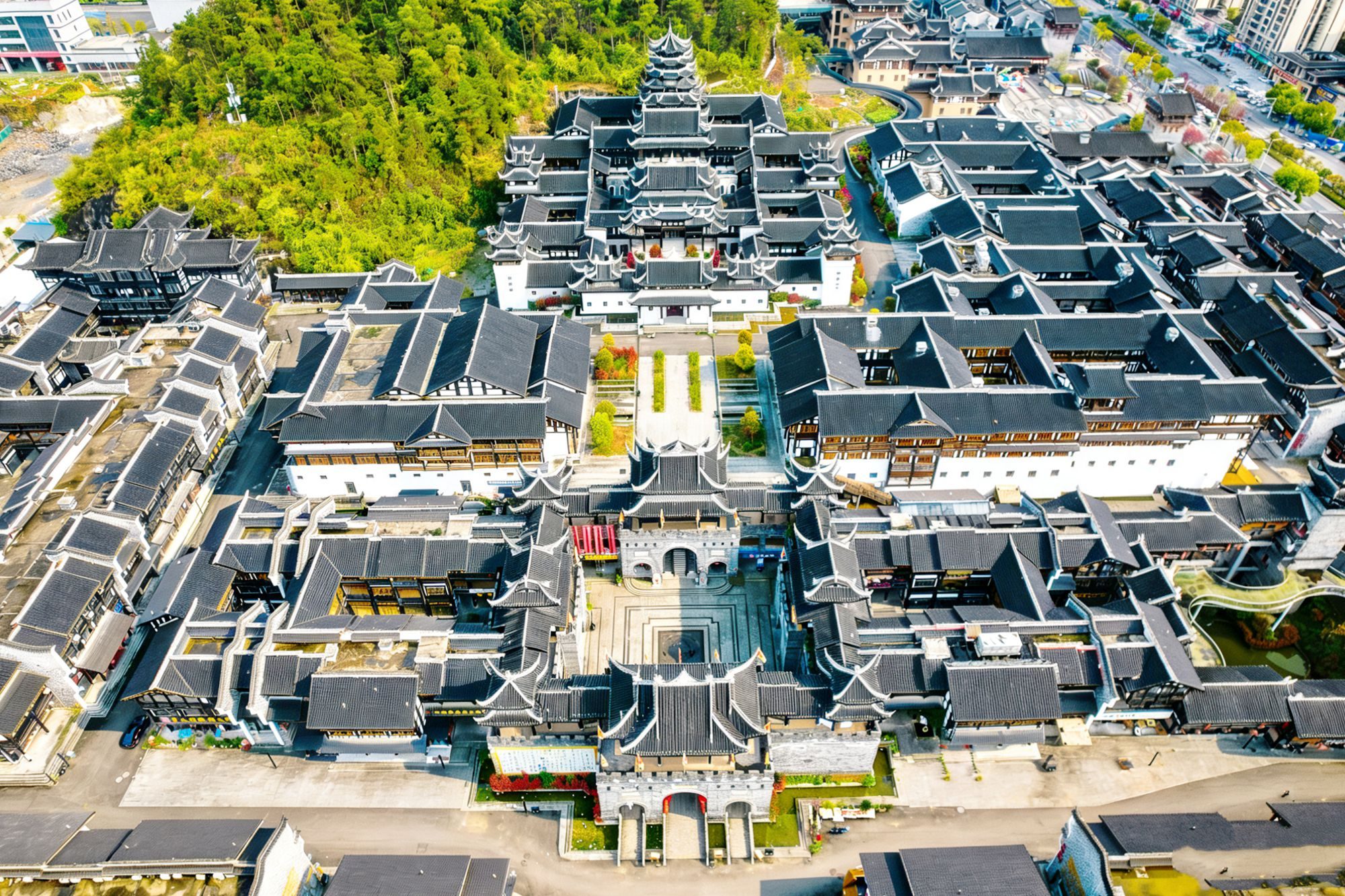 遵义古城位于汇川区,从高空俯瞰,整个古城呈中轴对称分布,周围青山环抱,环境清新自然,建筑青瓦飞檐,白墙木构错落有致,城内院落被茂盛绿植衬托得更多了几分古朴雅致。