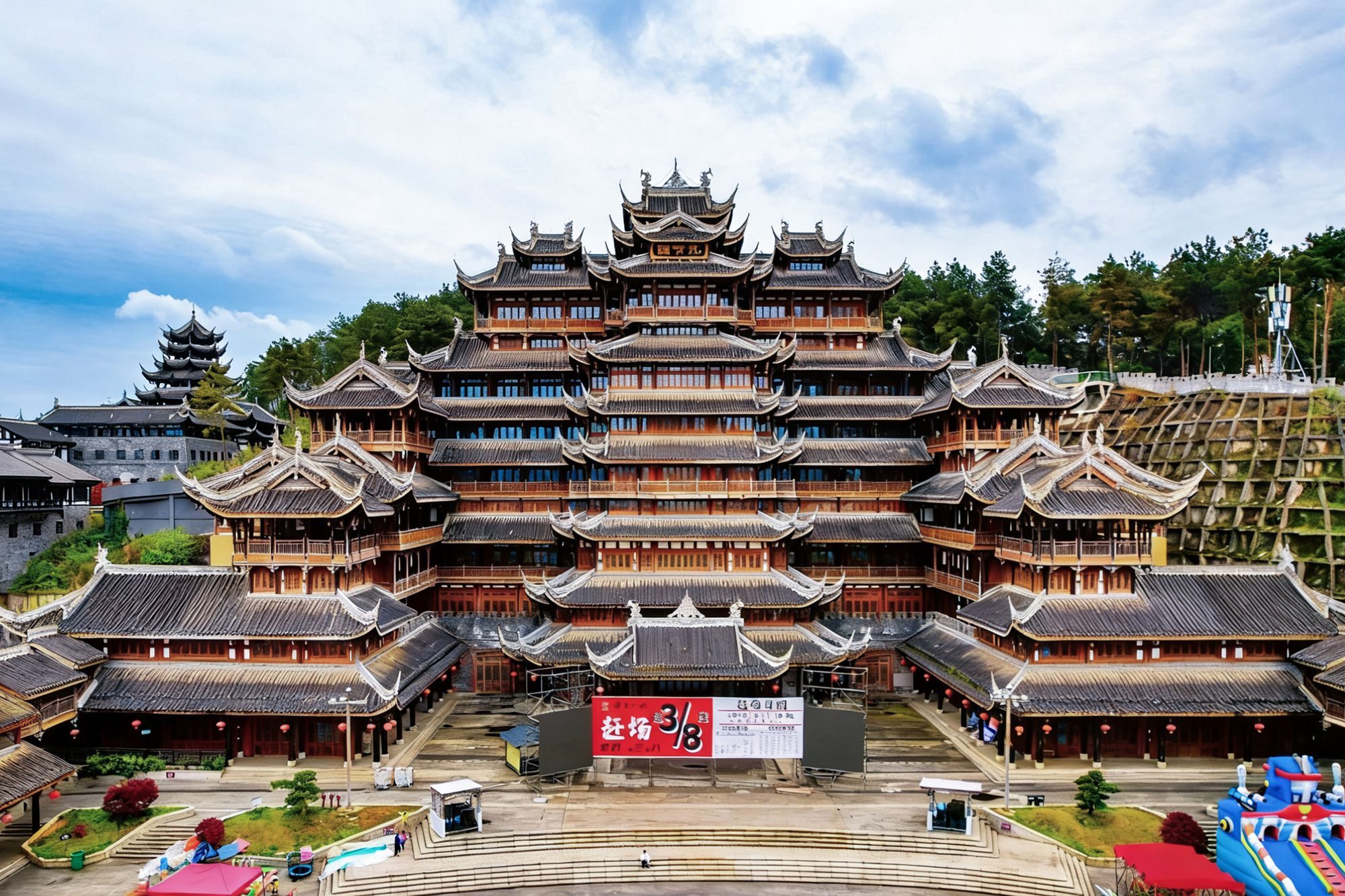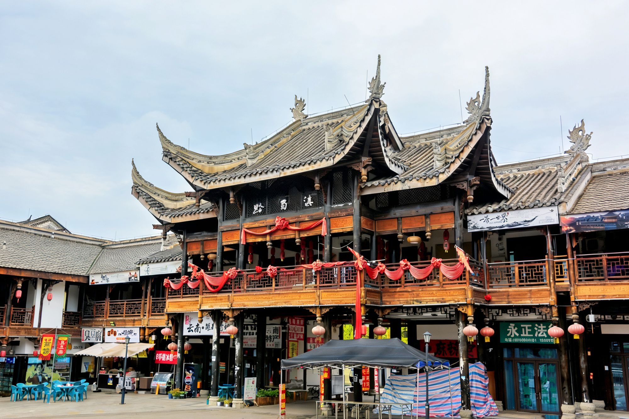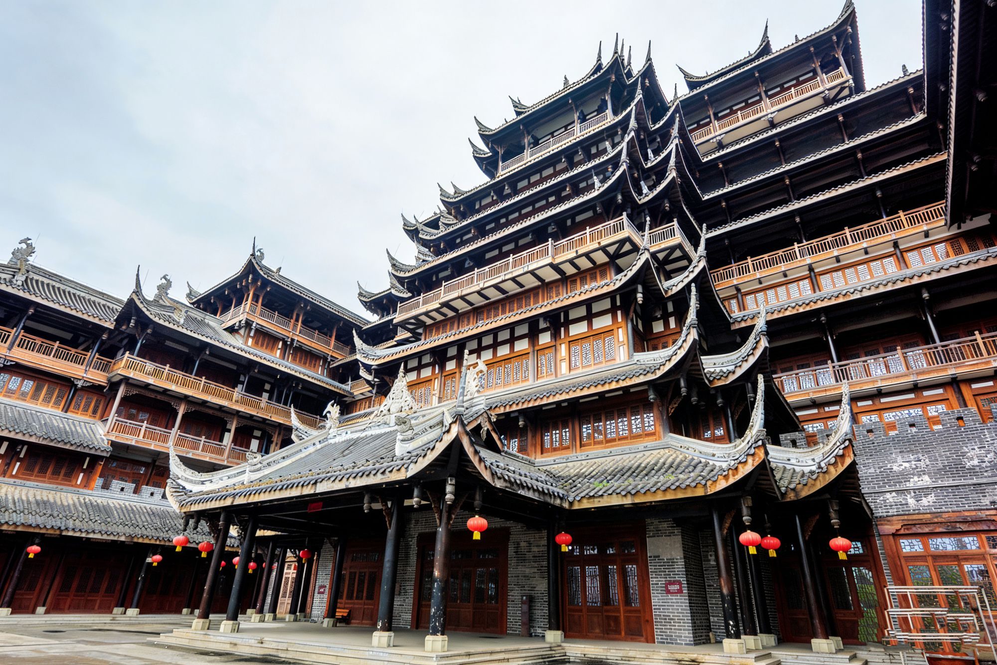九层主楼是古城的地标建筑,层层飞檐向上堆叠,木质廊柱与雕花栏杆精美细致,整座楼阁采用了最古老的建筑方式,没有一颗钉子,全部为榫卯结构搭建,是古建爱好者不能错过的地方。